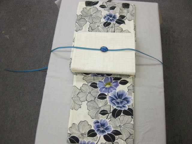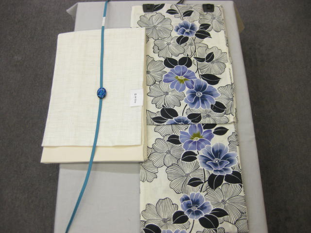 生成り地 花柄浴衣・仕立て上がり京袋帯・帯留と正絹三分紐の4点セットです ★