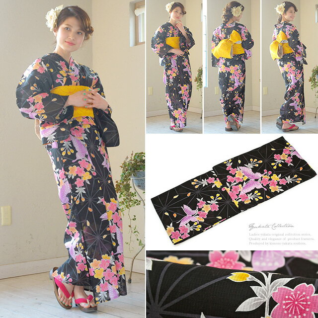 bonheur saisons Jec 夏しぐれ 凛 浴衣セット黒地に大きな麻の葉文と桜の花と大きな蝶がデザインされています。